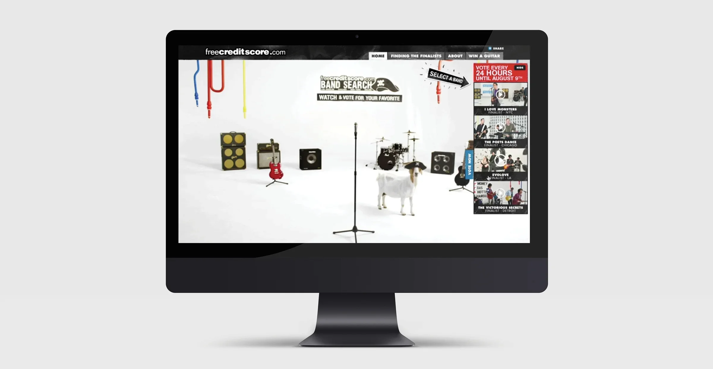 Site #1: After auditioning more than 100 unsigned bands in New York, Chicago, and Los Angeles, and opening submissions nationwide online, the site became the hub. It surfaced the top four acts from each city based on YouTube views. Each band performed one of five original FreeCreditScore.com songs, turning every submission into a 30-second ad people chose to watch.